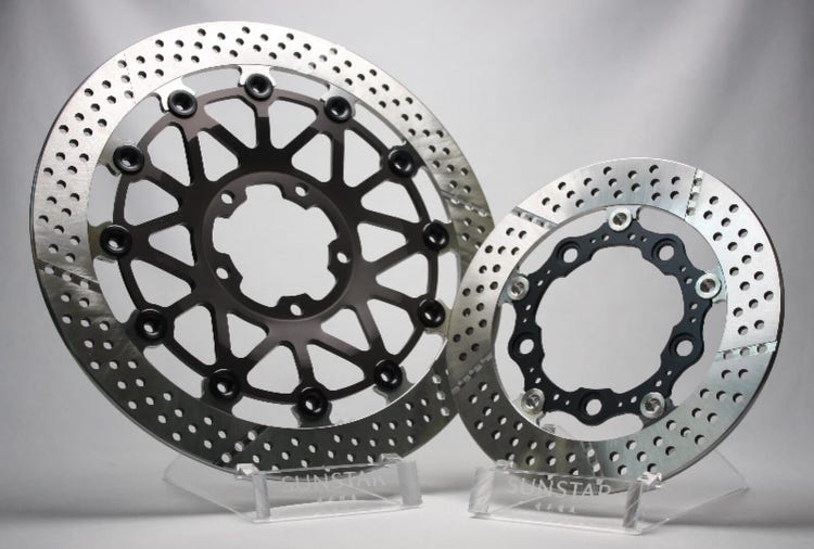 The Sunstar brand of sprockets and disc rotors shares the company name and is differentiated through the stylized yellow and blue logo.